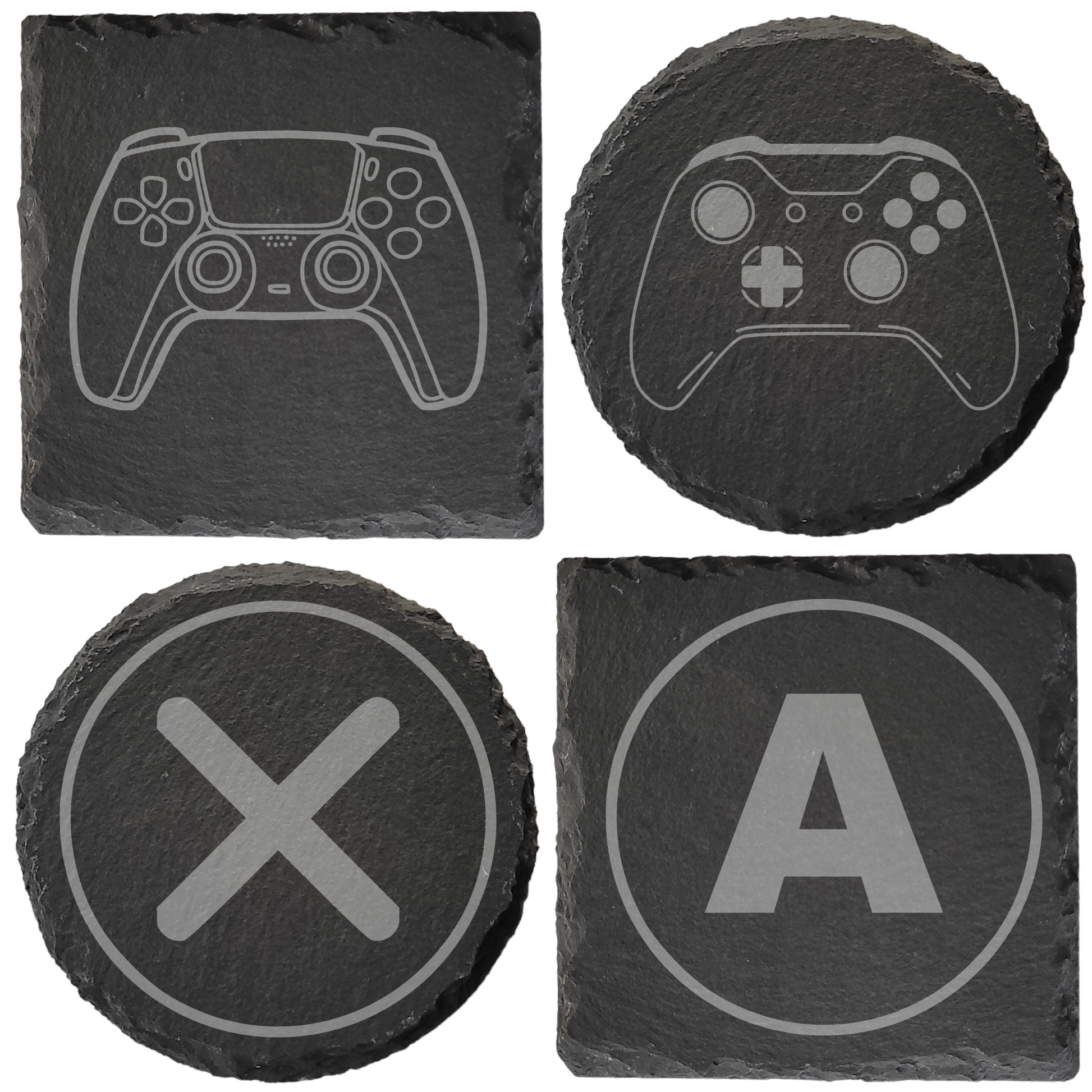Level up your coffee table with these premium slate coasters, precision laser-engraved with iconic Xbox and PlayStation controller designs. Each coaster features crisp detailing of classic button icons — X, O, △, ☐, A, B, X, Y — bringing console nostalgia to life in sleek monochrome.