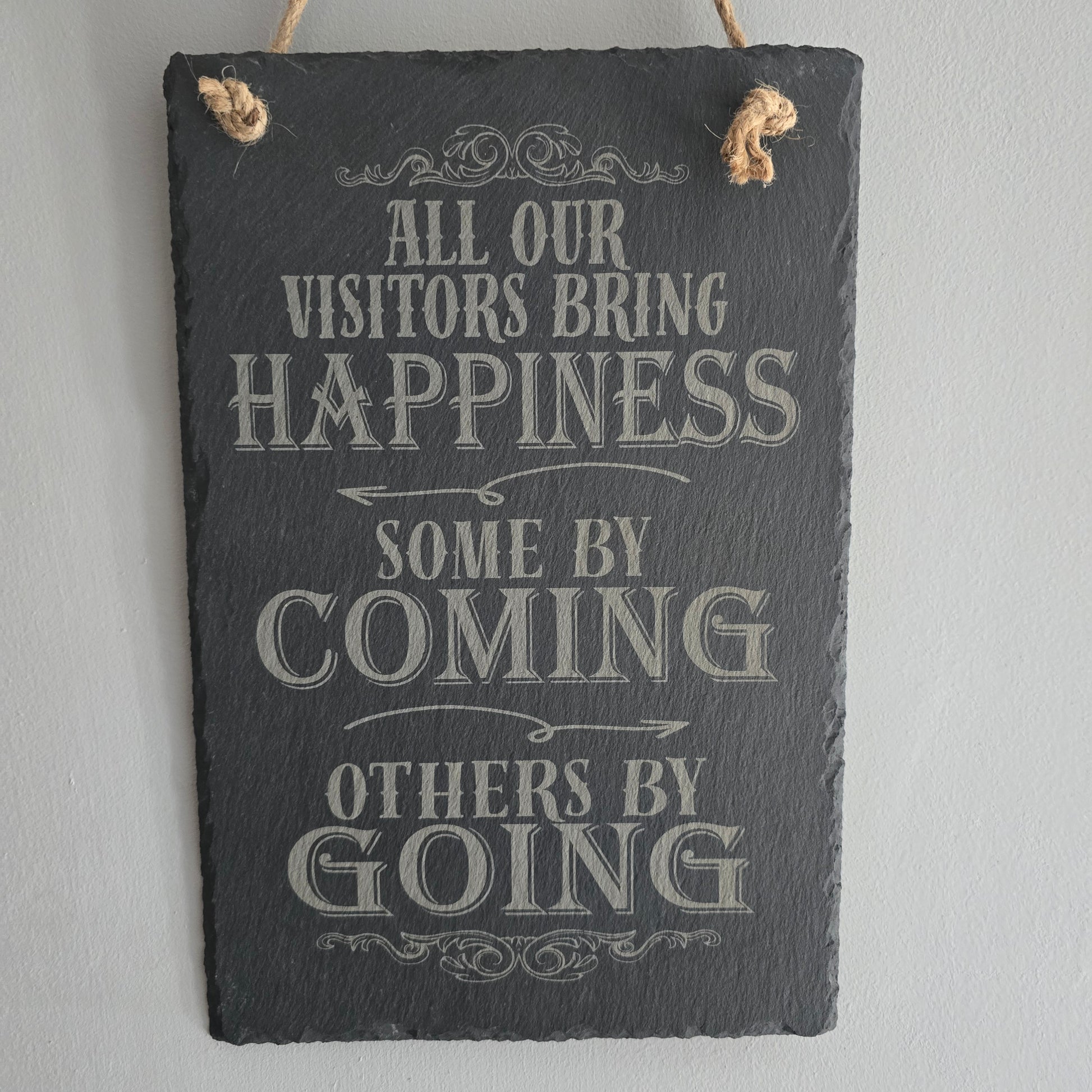 Add a dash of dry humour to your home with this engraved slate hanging sign that says it like it is: “All our visitors bring happiness… some by coming, others by going.” Perfect for entryways, porches, or kitchens, this rustic sign sets the tone with a wink and a smile. Crafted from natural slate with precision engraving, it’s a conversation starter for those who appreciate a bit of cheeky charm. Comes ready to hang with a jute rope—ideal for housewarmings, hostess gifts, or anyone who loves a good laugh.