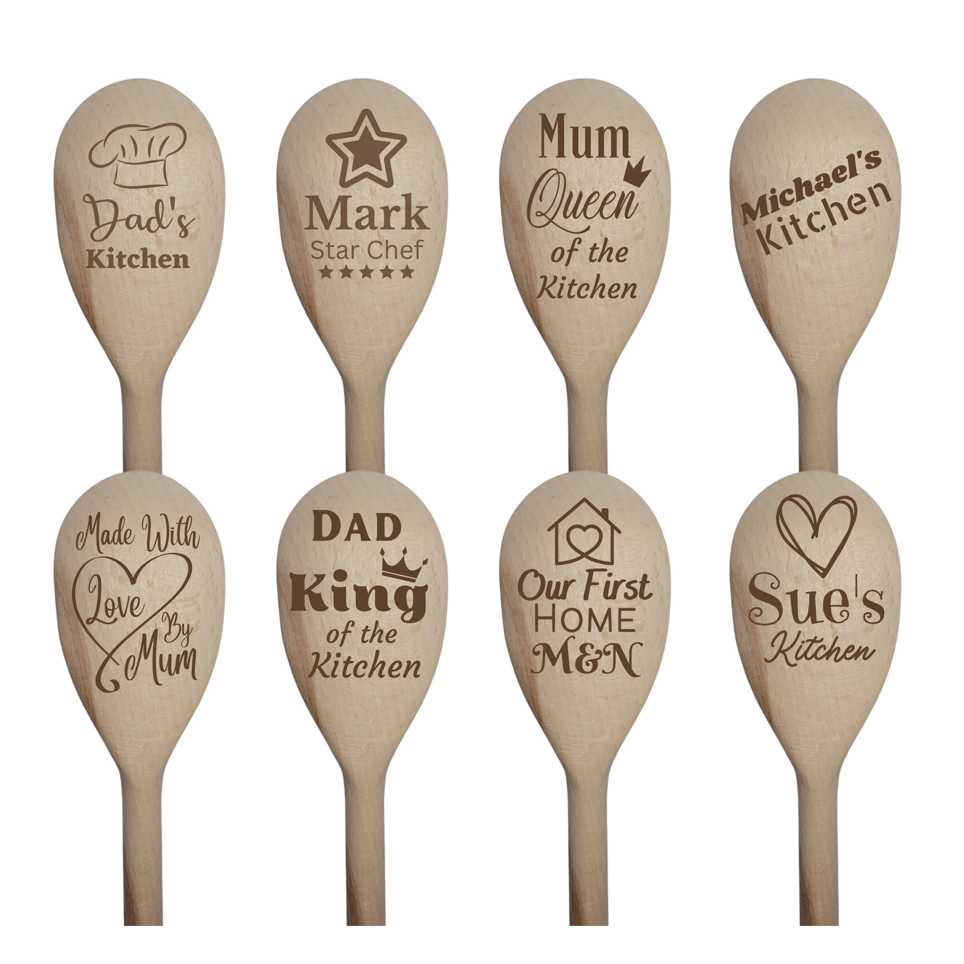 engraved wooden spoons. Choose from 8 distinctive designs — from whimsical to heartfelt — and finish it off with your choice of ribbon for that perfect final flourish. Whether you're celebrating a wedding, birthday, or simply want to stir up some joy, these spoons make thoughtful keepsakes and charming décor.